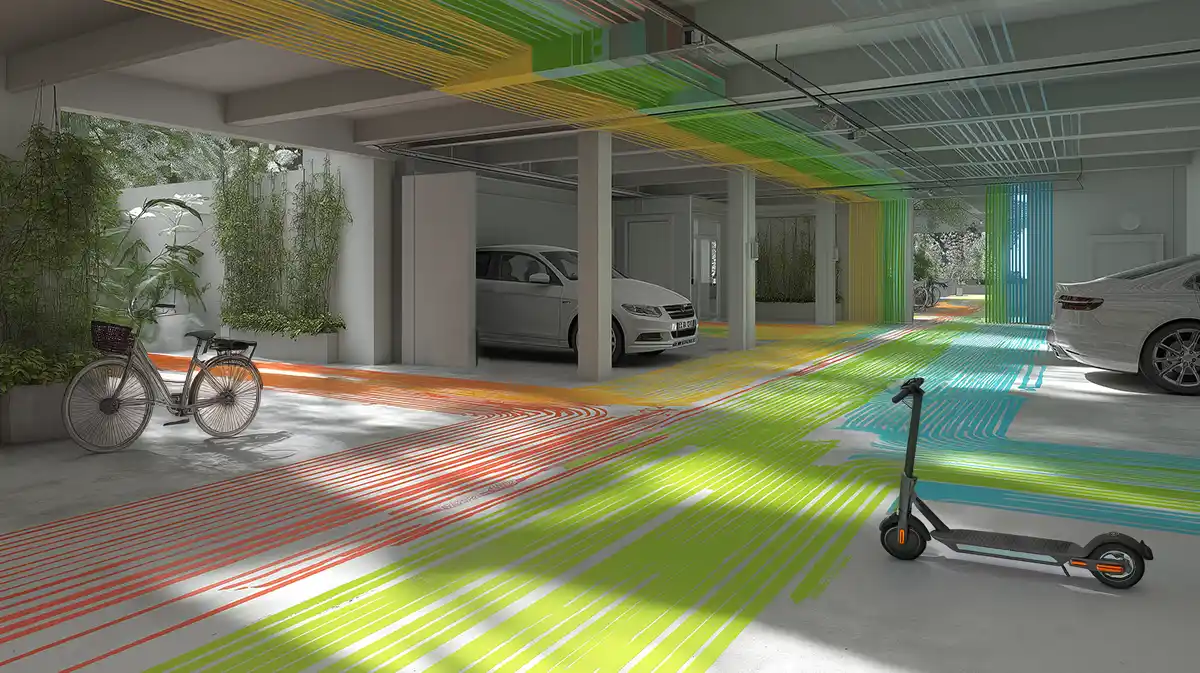 Integration von Flächen für Fahrräder, Lastenräder, E-Scooter und Carsharing-Fahrzeuge.